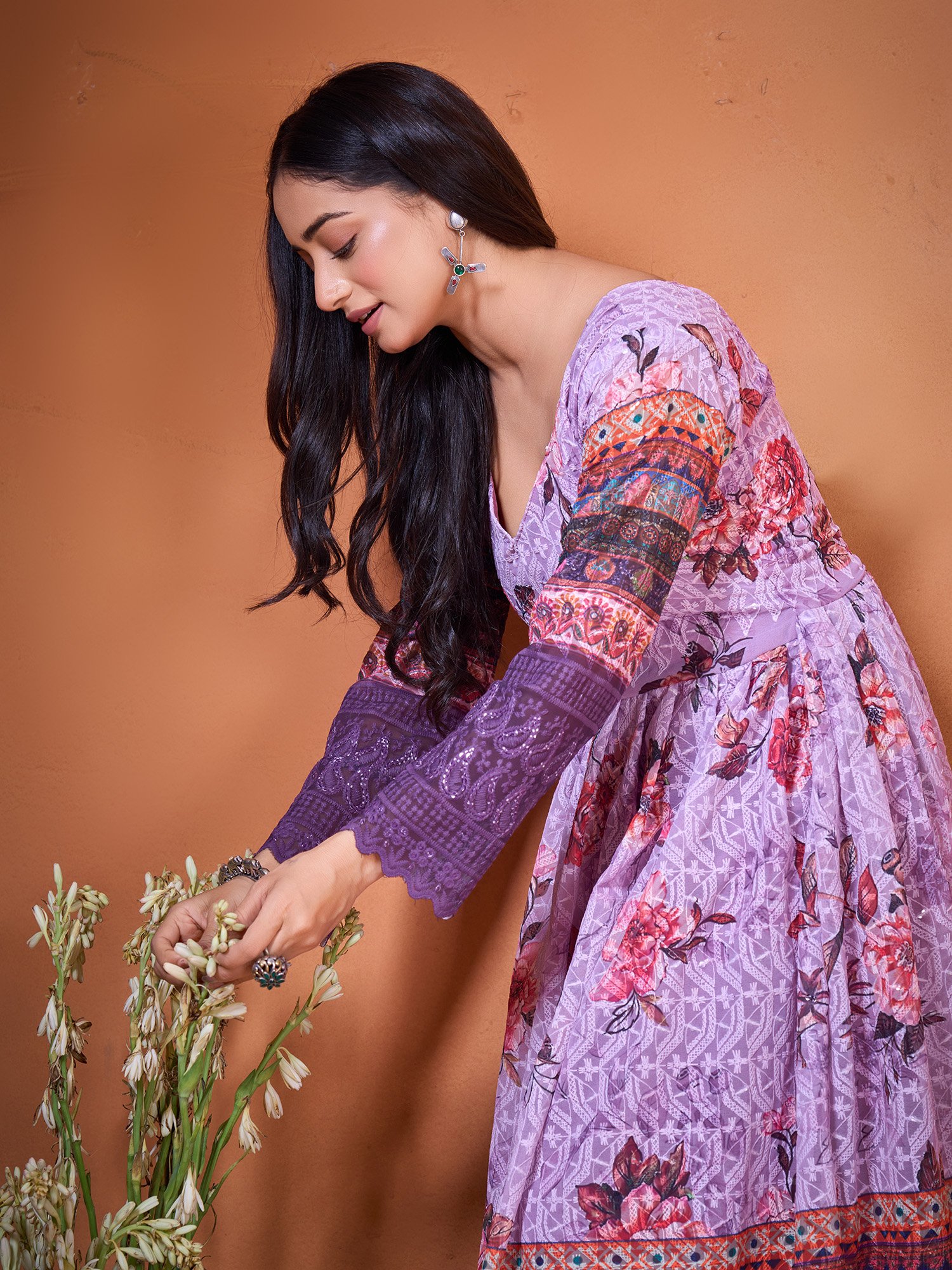 Elevate your ethnic wardrobe with this elegant Purple Anarkali Gown. Crafted from premium Cotton Silk, this ankle-length ensemble features sophisticated embroidery and a graceful 54-inch silhouette.